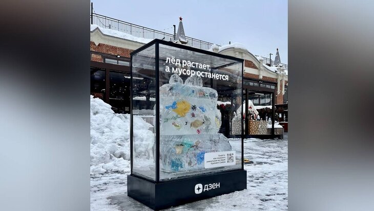 Ледяную скульптуру можно увидеть на территории фудмолла «Три вокзала. Депо». Она представляет собой массив льда, внутри которого заключены фрагменты пластика, упаковки и бытовых отходов — тех материалов, которые чаще всего обнаруживают во время арктических экспедиций. По мере таяния льда эти предметы становятся всё более заметными.